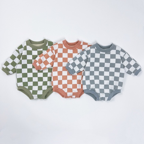 Bahar bebek yürüyor organik pamuk damalı baskı fransız Terry Snap düğmesi Bodysuit bebek kabarcık tulum